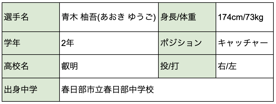 埼玉県大会では準決勝の山村学園戦で大会屈指の好投手、横田選手から6回表に逆転3ランホームランを放ち、タイブレーク11回表には勝ち越し打を放つなど勝負強さ、打撃センスを備えている。