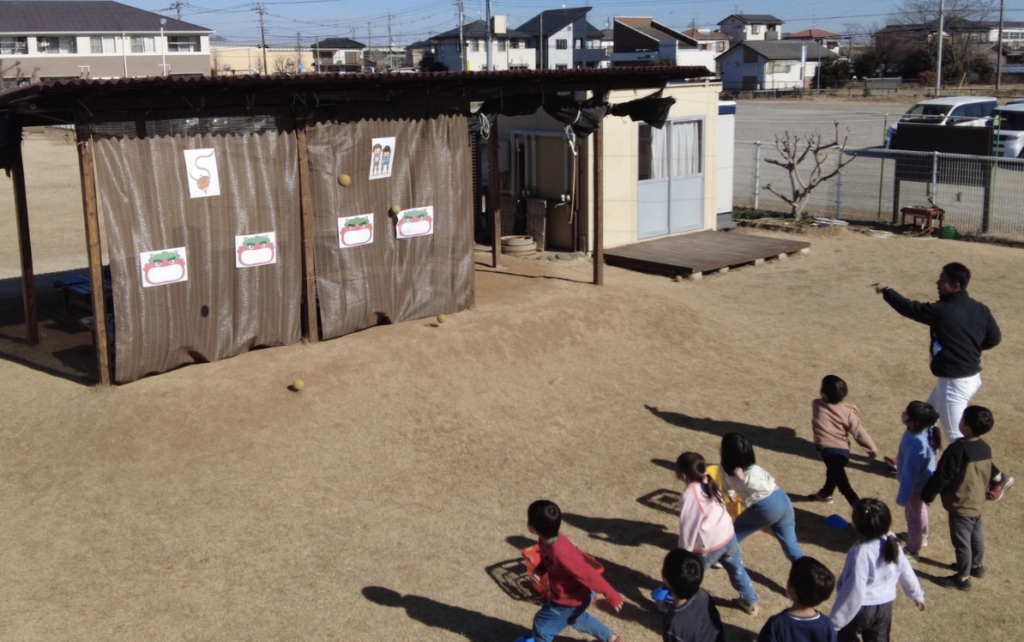 節分が近いこともあり、鬼の絵を的にして、そこに向かってボールを投げる。遠くに投げることを意識しながら、園児たちは次々と腕を振った。