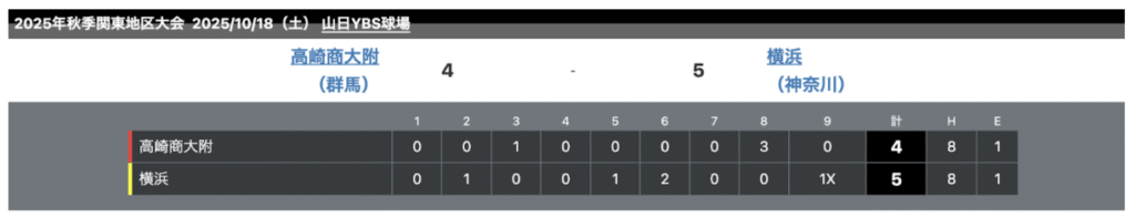 横浜が川上慧選手のこの試合2本目となるソロホームランでサヨナラ勝ち。高崎商大附は8回に一時同点に追いつく粘りを見せたが、あと一歩届かなかった。両チームのエースが最後までマウンドに立ち続けた熱戦だった。