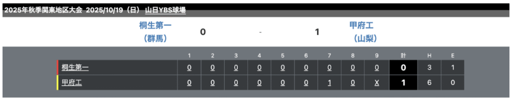 秋季関東地区大会の注目カードは、投手戦となった。桐生第一は序盤から走者を出すも決定打を欠き無得点。甲府工は7回、山下直太郎選手の本塁打で先制点を奪い、これが決勝点となった。両校とも守備と投手陣が安定し、最後まで緊迫感のある展開が続い