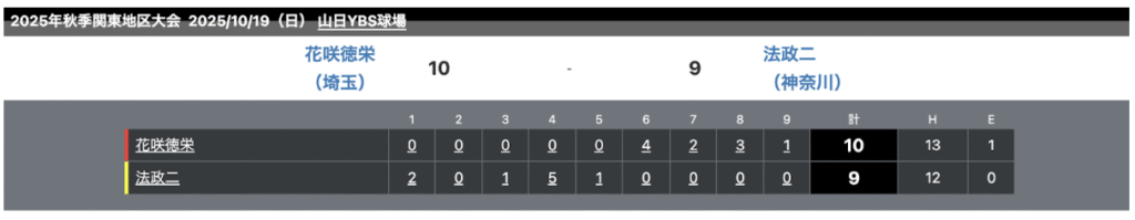 壮絶な打撃戦となった一戦は、花咲徳栄が0-9から驚異の粘りを見せ、最終的に10-9で法政二を下した。8回に岩井虹太郎選手の同点2ランで追いつくと、9回にはエース黒川凌大選手自らのバットで勝ち越し打。投げてはその黒川選手が176球を投げ抜き、最後までマウンドを守り切った。まさに執念でつかみ取った逆転勝利だった。